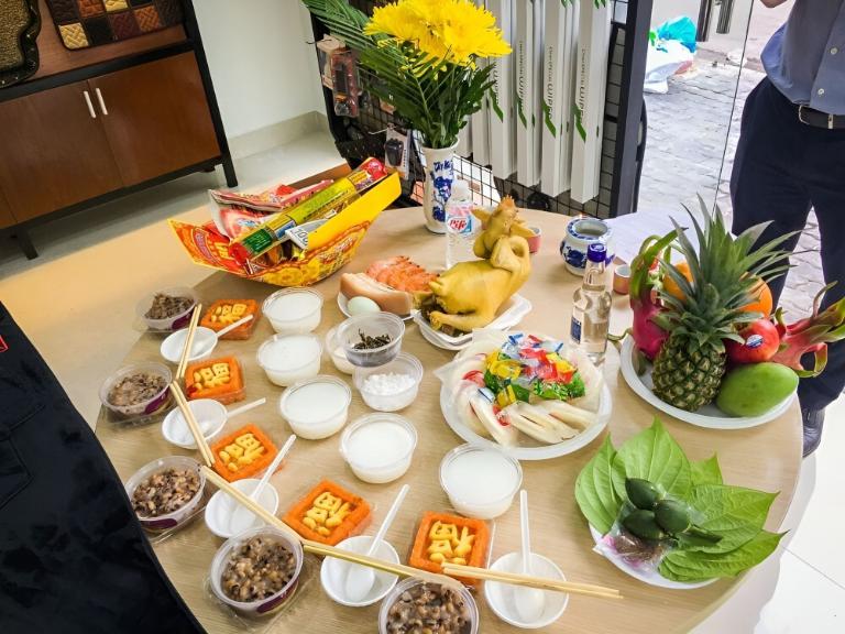 Giữ mâm lễ tinh gọn nhưng đủ thành tâm: hương hoa, mâm ngũ quả, nước sạch, rượu hoặc trà, trầu cau, gạo muối, chè bánh; tùy điều kiện có thể thêm tam sinh. Bàn thờ tạm đặt ngay ngắn, sạch sẽ; chuẩn bị bát hương, bài vị, đèn nến, bật sẵn đèn điện cho không gian sáng sủa, ấm áp.