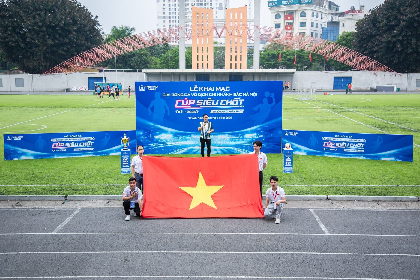 Chiều ngày 14/04/2026, tại Sân Xuân La (Xuân Đỉnh, Hà Nội), Thiên Khôi Group – Chi nhánh Bắc Hà Nội đã chính thức tổ chức Lễ Khai mạc Giải Bóng đá Vô địch Thiên Khôi Miền Bắc – Cúp Siêu Chốt – Kỳ I/2026, khép lại chuỗi khai mạc đầy sôi động của mùa giải năm nay. Buổi lễ có sự hiện diện của Ban Lãnh đạo, các Thành viên cùng những Đối tác xuất sắc của Chi nhánh Bắc Hà Nội, tạo nên bầu không khí hào hứng và tiếp thêm nguồn năng lượng tích cực trước giờ bóng lăn.