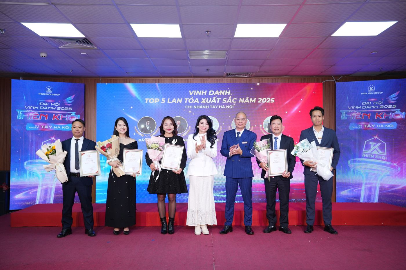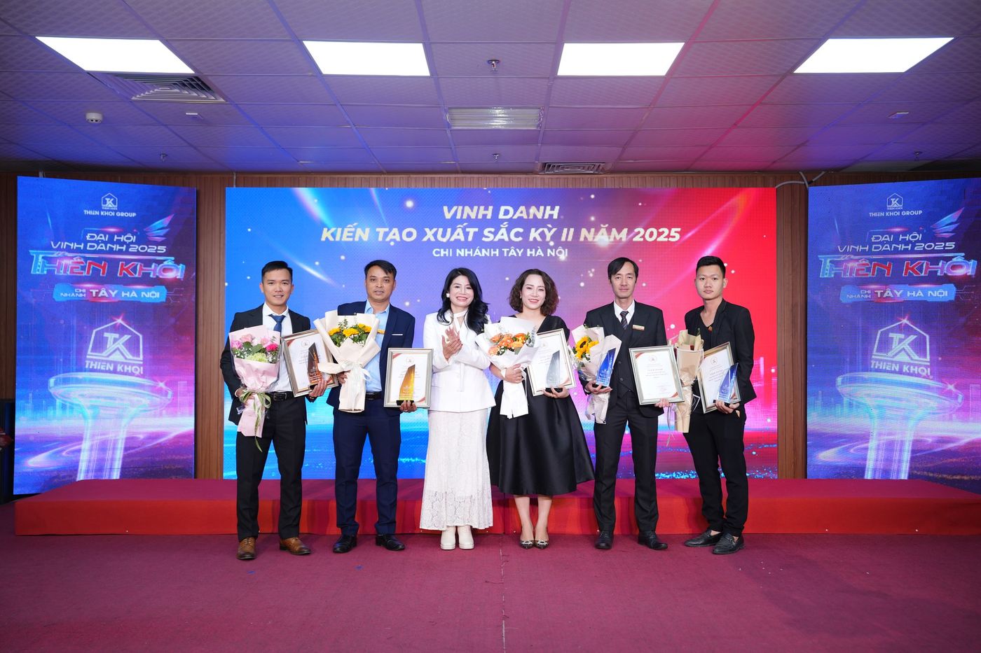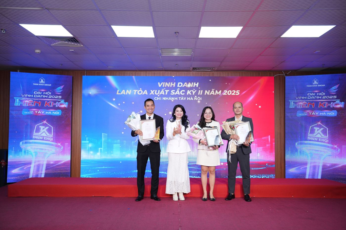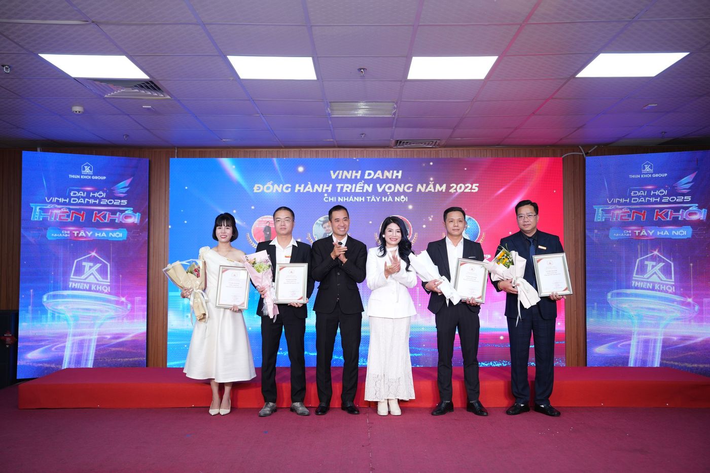 Trong năm 2025, Chi nhánh Tây Hà Nội ghi nhận nhiều kết quả tích cực trên hai phương diện: hiệu quả kinh doanh và công tác đầu tư. Những đóng góp ấy đã được tôn vinh tại Đại hội thông qua 7 hạng mục vinh danh, với 20 giải thưởng dành cho 137 cá nhân xuất sắc – những nhân tố xuất sắc góp phần tạo nên vị thế của Chi nhánh trong toàn hệ thống Thiên Khôi Group nói riêng và thị trường Bất động sản Thổ cư, Nhà phố trong khu vực.